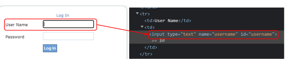 The attributes of the web element tell Selenium how to find the web elements. The User Name field has the attributes below. You want to select the attribute(s) that uniquely identifies the User Name edit field