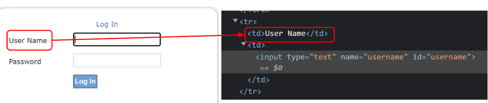 Use this method when you want to find a web element using the text associated with the web element with the exact text string. Let’s say you want to find the User Name label next to the edit field.